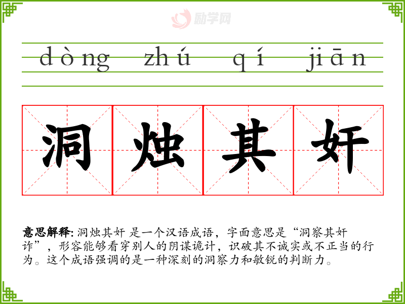 洞烛其奸 是一个汉语成语,字面意思是“洞察其奸诈”,形容能够看穿别人的阴谋诡计,识破其不诚实或不正当的行为。这个成语强调的是一种深刻的洞察力和敏锐的判断力。