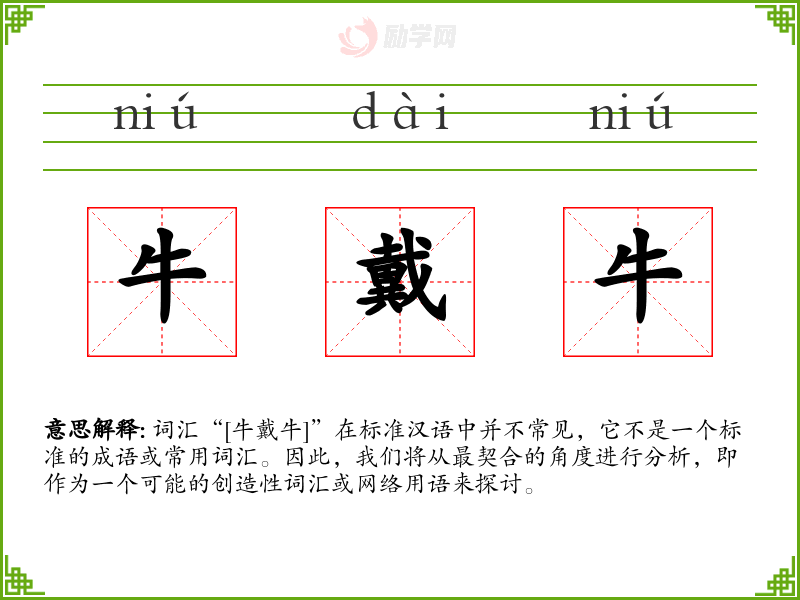 词汇“[牛戴牛]”在标准汉语中并不常见,它不是一个标准的成语或常用词汇。因此,我们将从最契合的角度进行分析,即作为一个可能的创造性词汇或网络用语来探讨。