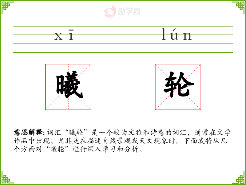词汇“曦轮”是一个较为文雅和诗意的词汇,通常在文学作品中出现,尤其是在描述自然景观或天文现象时。下面我将从几个方面对“曦轮”进行深入学*和分析。