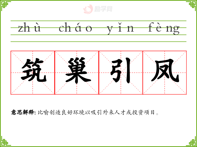 筑巢引凤的意思是:比喻创造良好环境以吸引外来人才或投资项目。