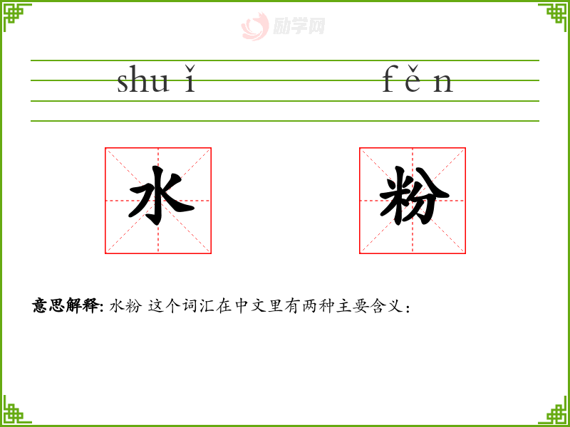 《说文》-粉,傅面者也。 《书·益稷》。郑注:“粉米,白米也。”-藻火粉米。 《世说新语·汰侈》-石崇厕常有十余婢侍列,皆丽服藻饰,置甲煎粉、沉香汁之属,无不毕备。