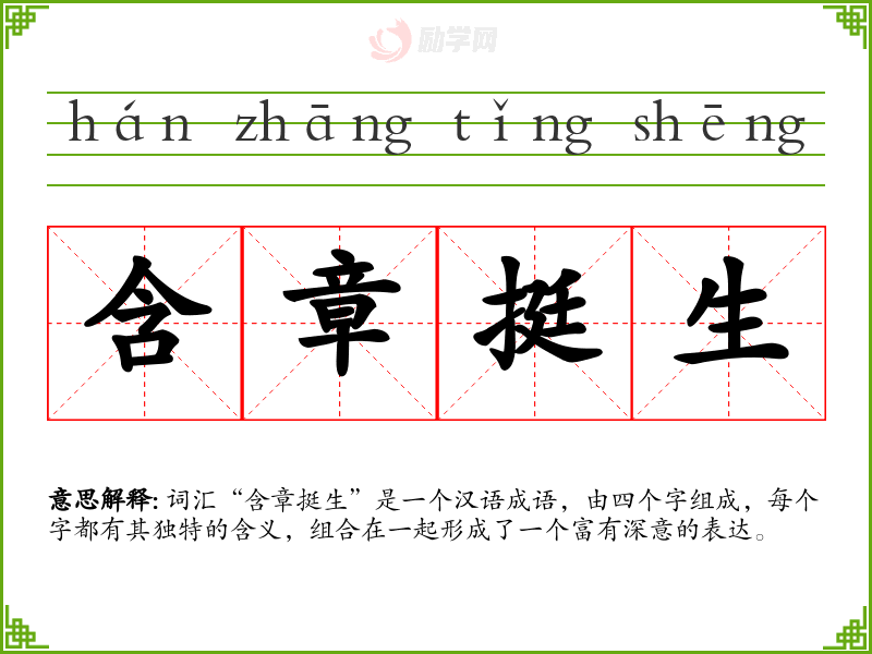 词汇“含章挺生”是一个汉语成语,由四个字组成,每个字都有其独特的含义,组合在一起形成了一个富有深意的表达。