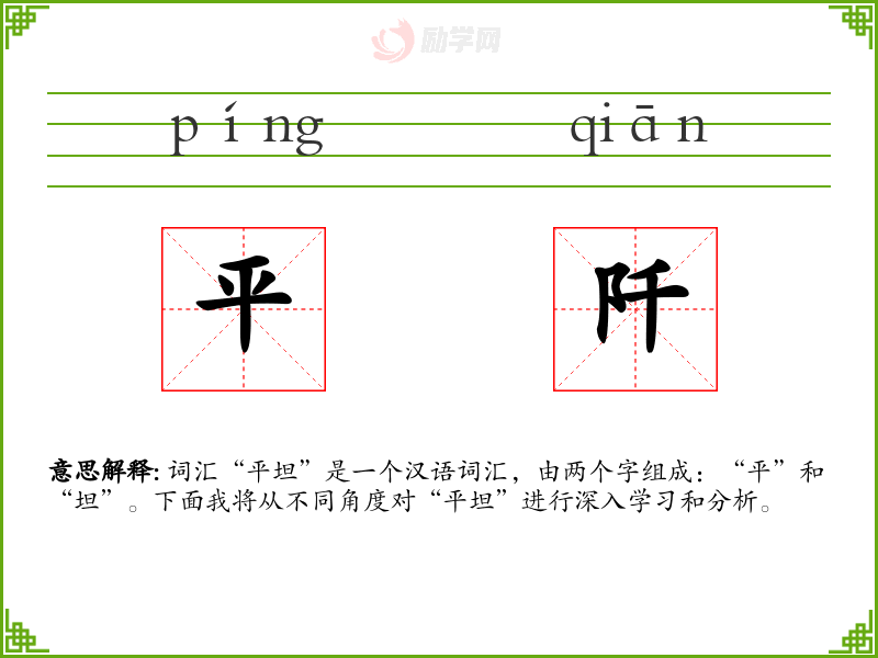 词汇“平坦”是一个汉语词汇,由两个字组成:“平”和“坦”。下面我将从不同角度对“平坦”进行深入学*和分析。
