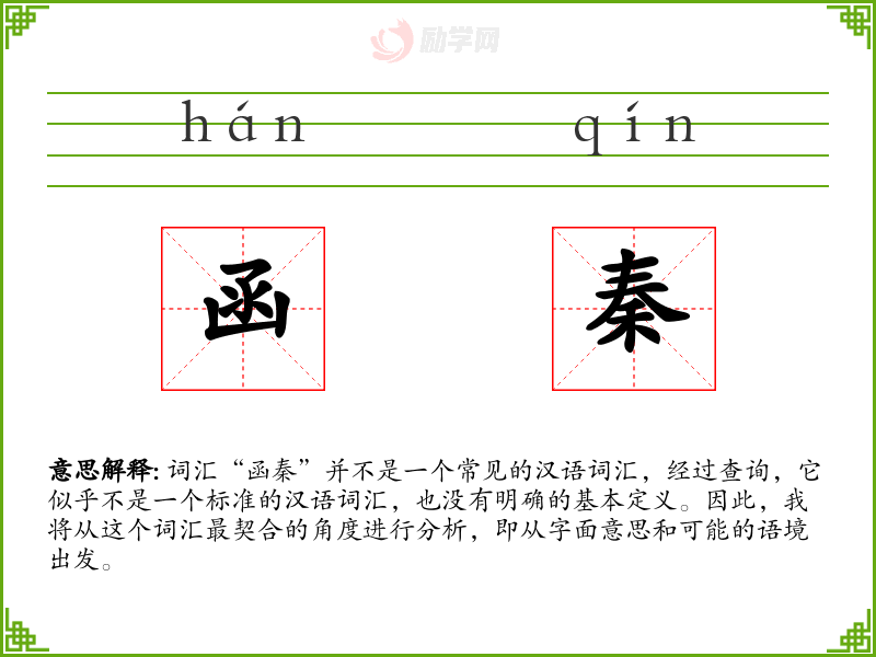 由于“函秦”不是一个标准词汇,它在不同语境下的使用可能非常有限。如果强行解释,可以想象它在文学作品中可能用来指代与秦朝相关的书信或者文件,或者在某些特定的历史或文化研究中作为一个术语出现。