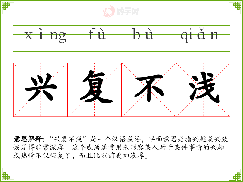 “兴复不浅”是一个汉语成语,字面意思是指兴趣或兴致恢复得非常深厚。这个成语通常用来形容某人对于某件事情的兴趣或热情不仅恢复了,而且比以前更加浓厚。