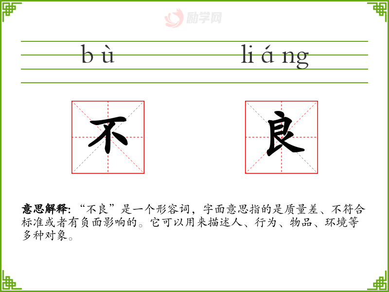“不良”是一个形容词,字面意思指的是质量差、不符合标准或者有负面影响的。它可以用来描述人、行为、物品、环境等多种对象。
