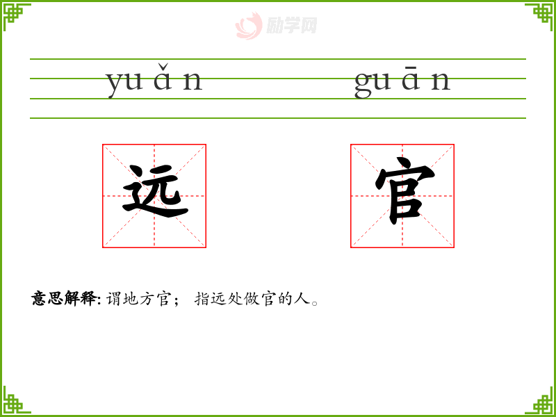 《说文》-远,辽也。 《尔雅》-远,遐也。 《礼记·王制》。注:“九州之外也。”-屏之远方。 《礼记·中庸》-柔远人也。 《礼记·乐记》-穷高极远。 《战国策·赵策》-念悲其远。 《左传·僖公三十三年》-远主备之,无乃不可乎? 《左传·三十三年》-劳师以袭远,非所闻也。 唐·杜牧《阿房宫赋》-缦立远视。 清·徐珂《清稗类钞·战事类》-火器利袭远,技击利巷战。 《广东军务记》-极目远望。