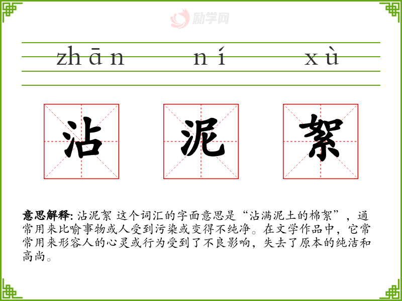 沾泥絮 这个词汇的字面意思是“沾满泥土的棉絮”,通常用来比喻事物或人受到污染或变得不纯净。在文学作品中,它常常用来形容人的心灵或行为受到了不良影响,失去了原本的纯洁和高尚。
