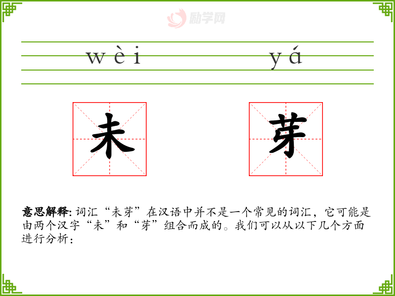 词汇“未芽”在汉语中并不是一个常见的词汇,它可能是由两个汉字“未”和“芽”组合而成的。我们可以从以下几个方面进行分析: