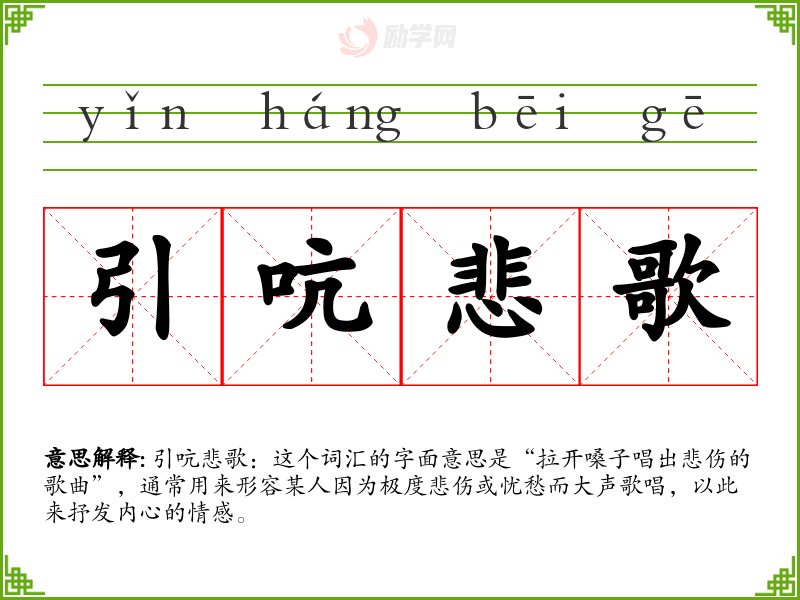引吭悲歌:这个词汇的字面意思是“拉开嗓子唱出悲伤的歌曲”,通常用来形容某人因为极度悲伤或忧愁而大声歌唱,以此来抒发内心的情感。