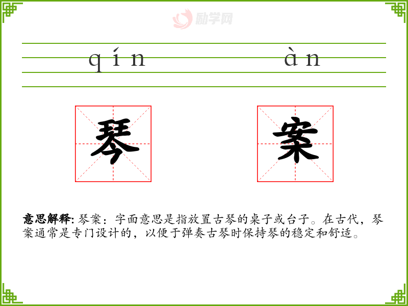 琴案:字面意思是指放置古琴的桌子或台子。在古代,琴案通常是专门设计的,以便于弹奏古琴时保持琴的稳定和舒适。