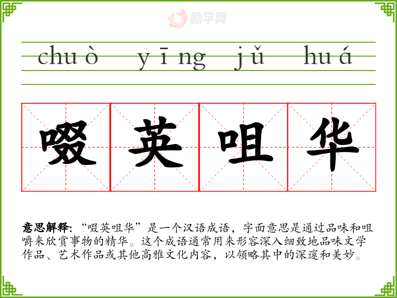 啜英咀华的意思是:“啜”念chuò。比喻品赏、体味诗文的精华。