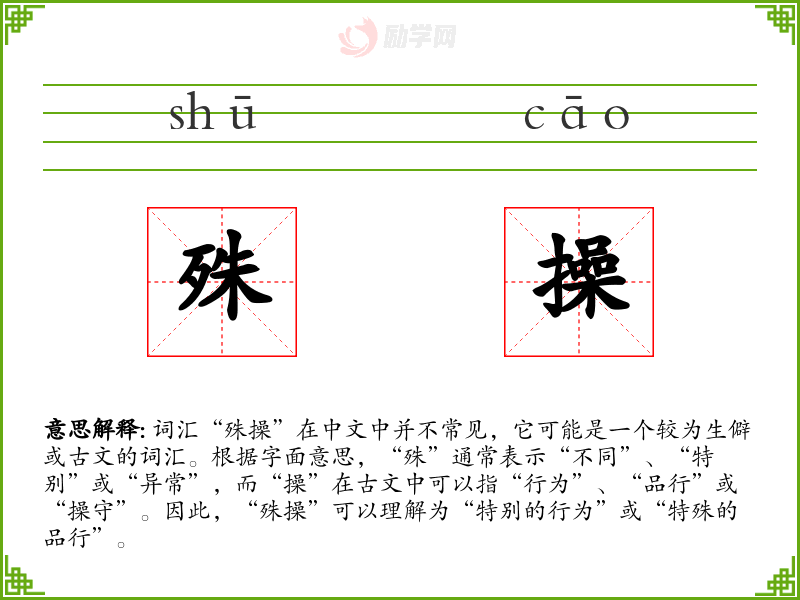 - 理解:“殊操”是一个富有文化内涵的词汇,虽然在现代汉语中不常见,但在理解和欣赏**传统文化时,它是一个重要的词汇。