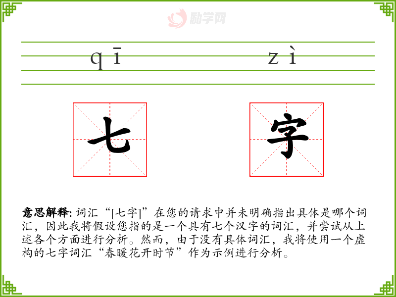 词汇“[七字]”在您的请求中并未明确指出具体是哪个词汇,因此我将假设您指的是一个具有七个汉字的词汇,并尝试从上述各个方面进行分析。然而,由于没有具体词汇,我将使用一个虚构的七字词汇“春暖花开时节”作为示例进行分析。