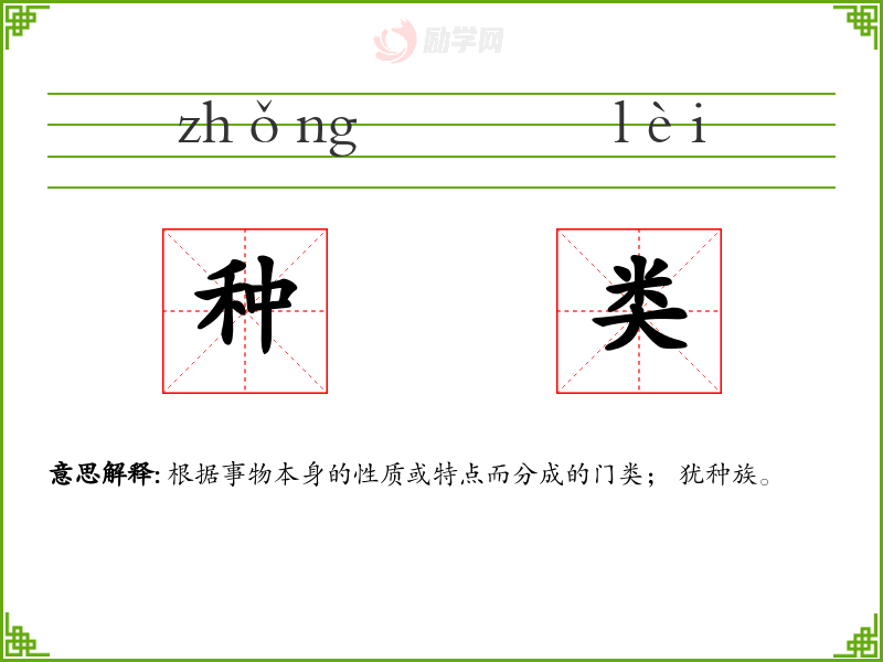 种类的意思是:根据事物本身的性质或特点而分成的门类; 犹种族。