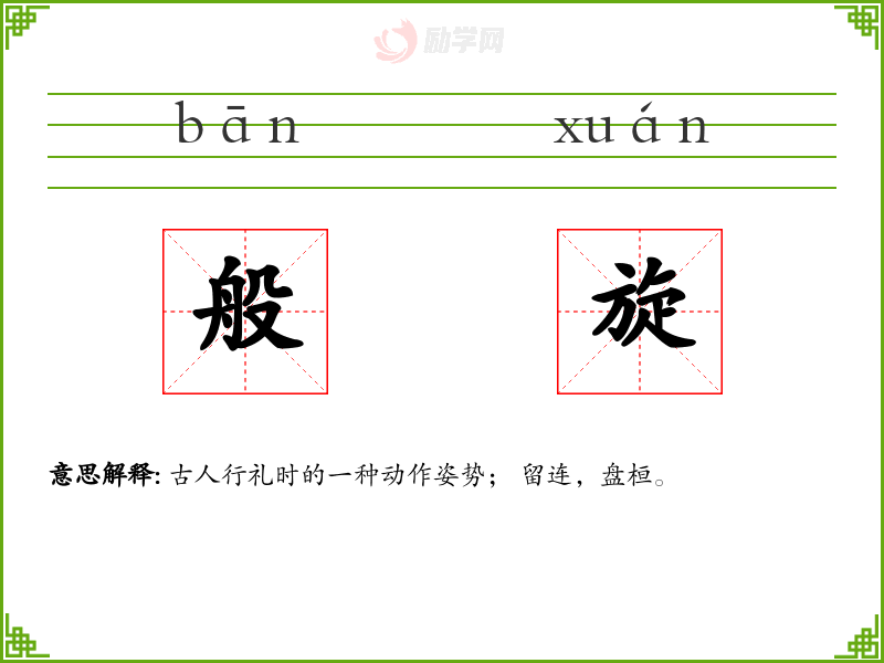 般旋的意思是:古人行礼时的一种动作姿势; 留连,盘桓。