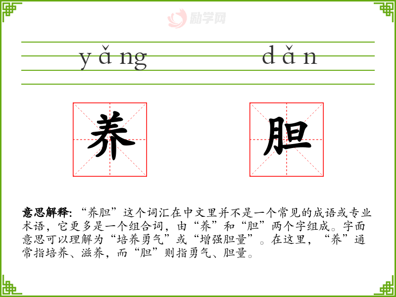 - 文学语境:在文学作品中,可能会用“养胆”来形容一个人通过某种方式或经历来增强自己的勇气和决心。