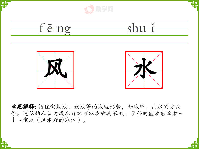 风水的意思是:指住宅基地、坟地等的地理形势,如地脉、山水的方向等。迷信的人认为风水好坏可以影响其家族、子孙的盛衰吉凶看~ㄧ~宝地(风水好的地方)。
