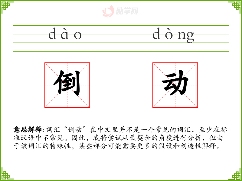 词汇“倒动”在中文里并不是一个常见的词汇,至少在标准汉语中不常见。因此,我将尝试从最契合的角度进行分析,但由于该词汇的特殊性,某些部分可能需要更多的假设和创造性解释。
