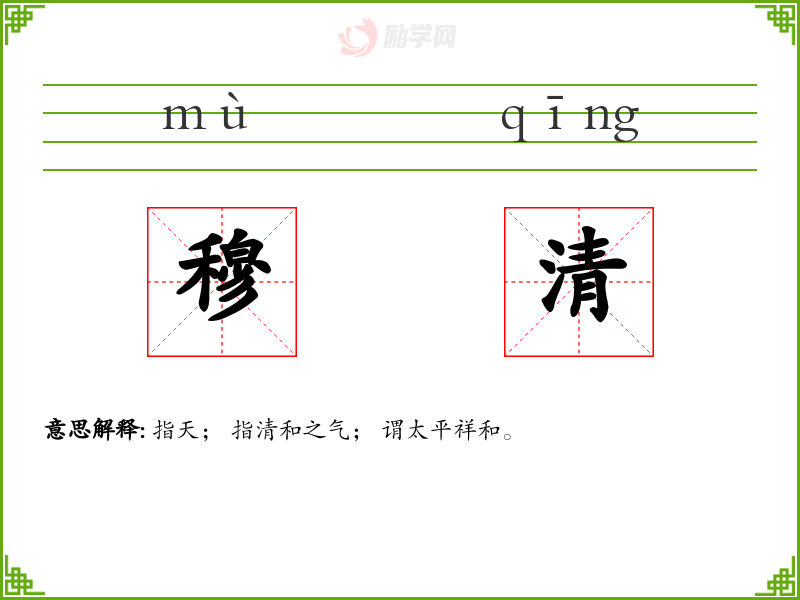 穆清的意思是:指天; 指清和之气; 谓太平祥和。