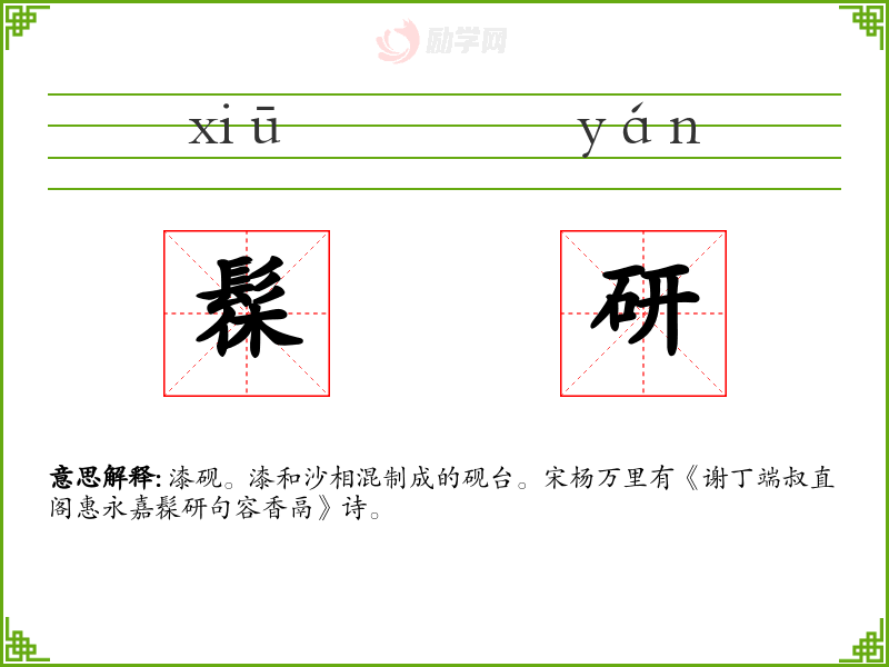 髹研的意思是:漆砚。漆和沙相混制成的砚台。宋杨万里有《谢丁端叔直阁惠永嘉髹研句容香鬲》诗。
