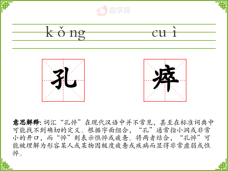 词汇“孔悴”在现代汉语中并不常见,甚至在标准词典中可能找不到确切的定义。根据字面组合,“孔”通常指小洞或非常小的开口,而“悴”则表示憔悴或疲惫。将两者结合,“孔悴”可能被理解为形容某人或某物因极度疲惫或疾病而显得非常虚弱或憔悴。