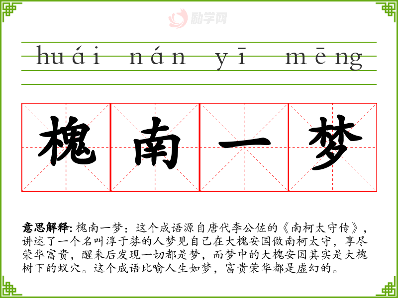 槐南一梦:这个成语源自唐代李公佐的《南柯太守传》,讲述了一个名叫淳于棼的人梦见自己在大槐安国做南柯太守,享尽荣华富贵,醒来后发现一切都是梦,而梦中的大槐安国其实是大槐树下的蚁穴。这个成语比喻人生如梦,富贵荣华都是虚幻的。