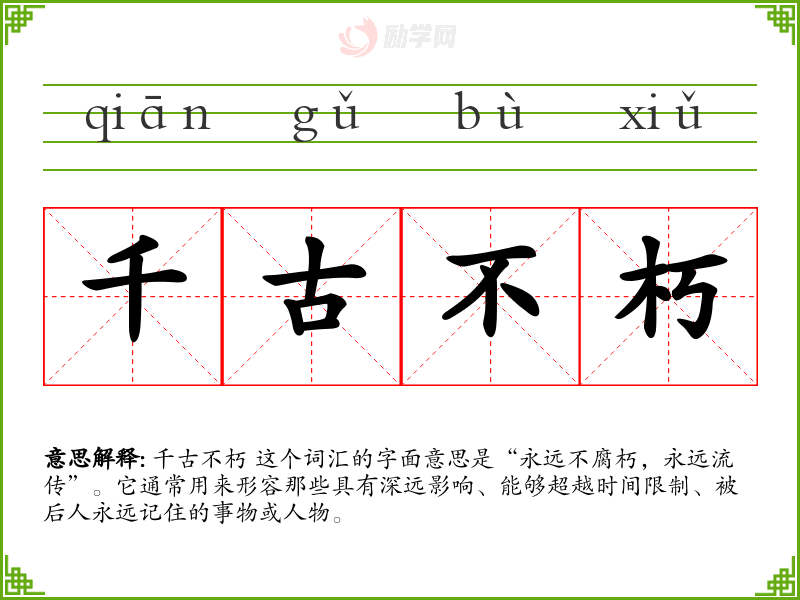 千古不朽 这个词汇的字面意思是“永远不腐朽,永远流传”。它通常用来形容那些具有深远影响、能够超越时间限制、被后人永远记住的事物或人物。