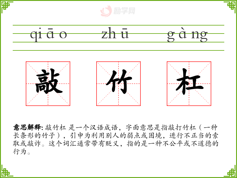 敲竹杠 是一个汉语成语,字面意思是指敲打竹杠(一种长条形的竹子),引申为利用别人的弱点或困境,进行不正当的索取或敲诈。这个词汇通常带有贬义,指的是一种不公平或不道德的行为。