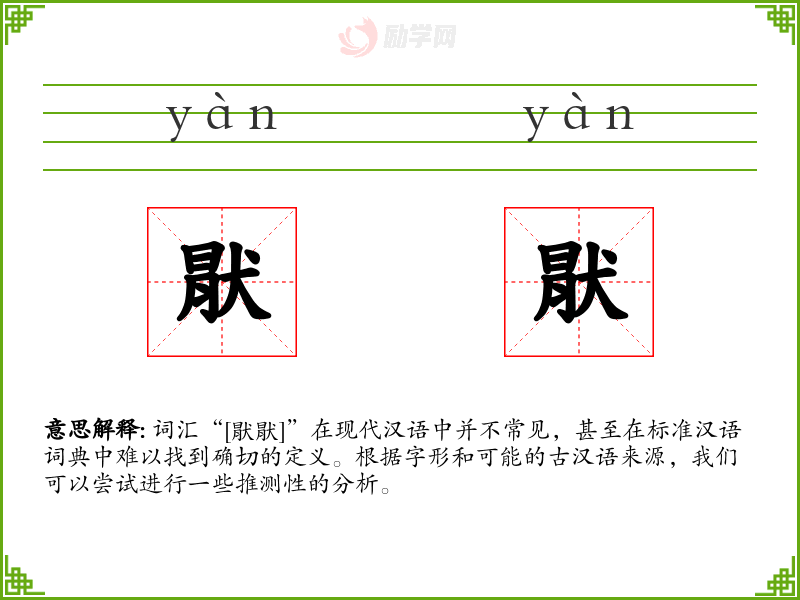 词汇“[猒猒]”在现代汉语中并不常见,甚至在标准汉语词典中难以找到确切的定义。根据字形和可能的古汉语来源,我们可以尝试进行一些推测性的分析。