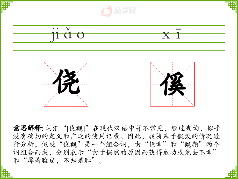 词汇“[侥觍]”在现代汉语中并不常见,经过查询,似乎没有确切的定义和广泛的使用记录。因此,我将基于假设的情况进行分析,假设“侥觍”是一个组合词,由“侥幸”和“觍颜”两个词组合而成,分别表示“由于偶然的原因而获得成功或免去不幸”和“厚着脸皮,不知羞耻”。
