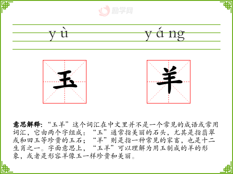 同义词:珍兽、美玉、宝羊 反义词:(由于“玉羊”不是一个常用词汇,反义词可能不明显,但可以考虑与“普通”、“平凡”相关的词汇)