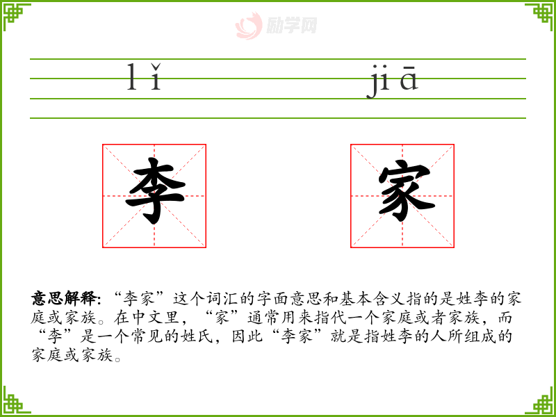 “李家”这个词汇的字面意思和基本含义指的是姓李的家庭或家族。在中文里,“家”通常用来指代一个家庭或者家族,而“李”是一个常见的姓氏,因此“李家”就是指姓李的人所组成的家庭或家族。