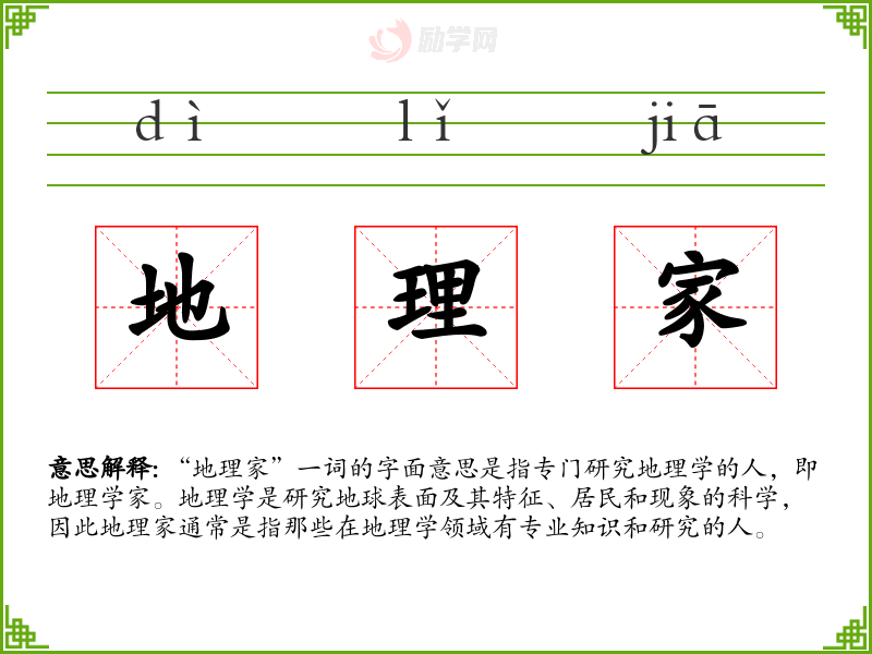 同义词:地理学家、地理学者、地理专家 反义词:非地理家(这个词并不常见,通常会用“非专业人士”或“外行”来表示)