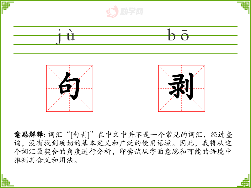 词汇“[句剥]”在中文中并不是一个常见的词汇,经过查询,没有找到确切的基本定义和广泛的使用语境。因此,我将从这个词汇最契合的角度进行分析,即尝试从字面意思和可能的语境中推测其含义和用法。