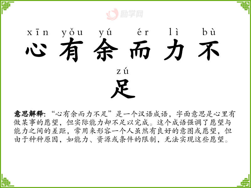“心有余而力不足”是一个汉语成语,字面意思是心里有做某事的愿望,但实际能力却不足以完成。这个成语强调了愿望与能力之间的差距,常用来形容一个人虽然有良好的意图或愿望,但由于种种原因,如能力、资源或条件的限制,无法实现这些愿望。