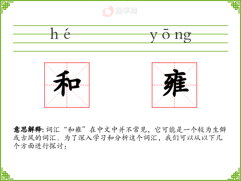 词汇“和雍”在中文中并不常见,它可能是一个较为生僻或古风的词汇。为了深入学*和分析这个词汇,我们可以从以下几个方面进行探讨: