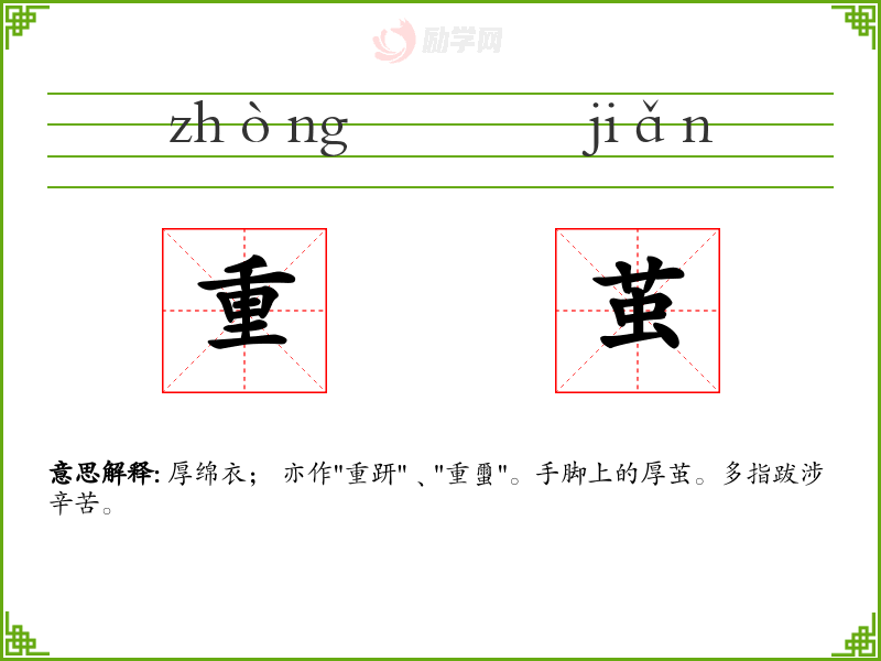 重茧的意思是:厚绵衣; 亦作"重趼"﹑"重蠒"。手脚上的厚茧。多指跋涉辛苦。