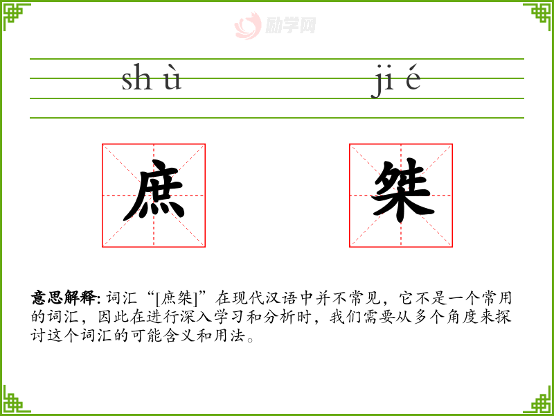 词汇“[庶桀]”在现代汉语中并不常见,它不是一个常用的词汇,因此在进行深入学*和分析时,我们需要从多个角度来探讨这个词汇的可能含义和用法。