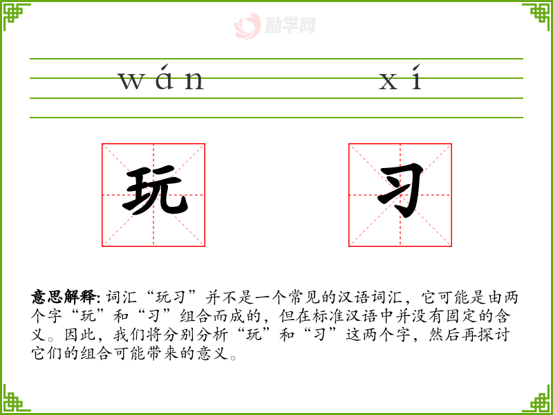 - **玩**:虽然“玩”不是一个常用词汇,但它可以被理解为在娱乐中学,或者在学中找到乐趣。这种组合强调了学*和娱乐的结合,鼓励人们在轻松的氛围中获取知识。