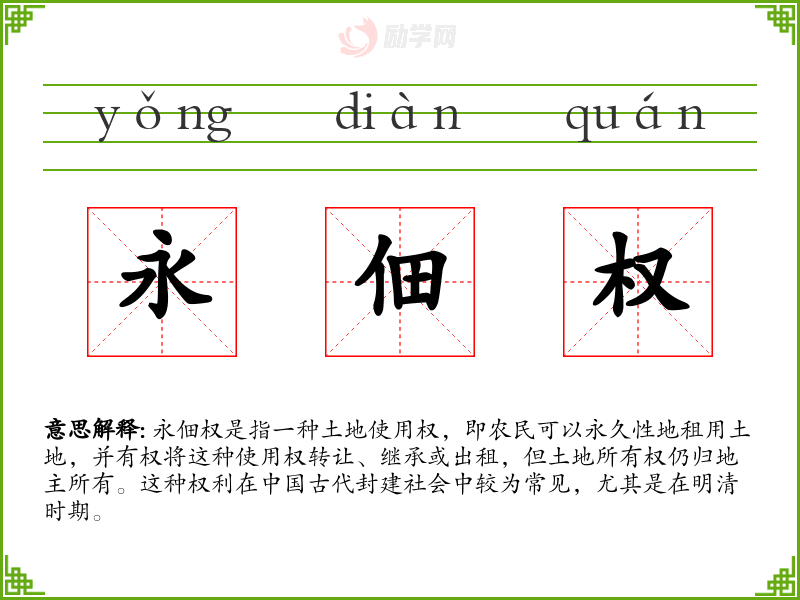 - 永佃权的设立,一定程度上缓解了农民对土地的渴望与地主对土地的垄断之间的矛盾。
