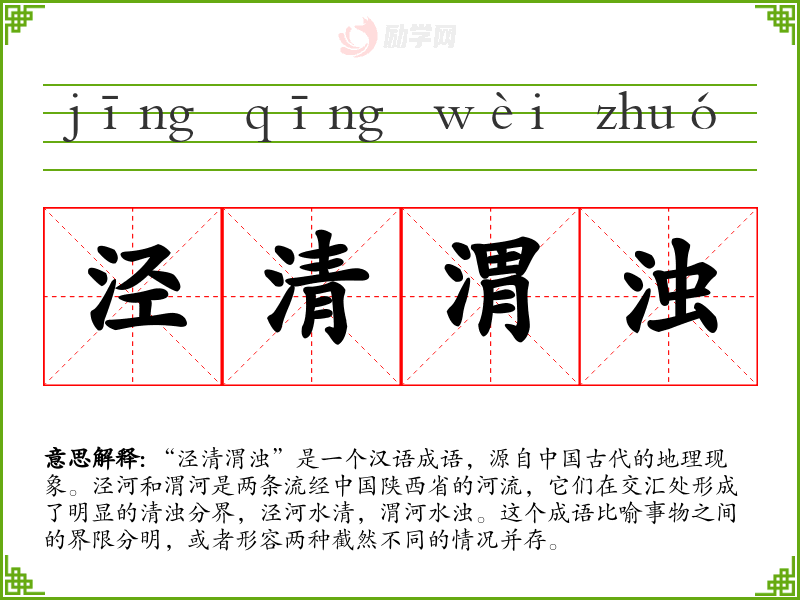 “泾清渭浊”这个成语不仅是一个地理现象的描述,更是一个富有哲理的比喻。它教会我们在复杂的世界中寻找和坚持清晰和明确的界限,这对于我的语言学*和表达有着重要的启示作用。