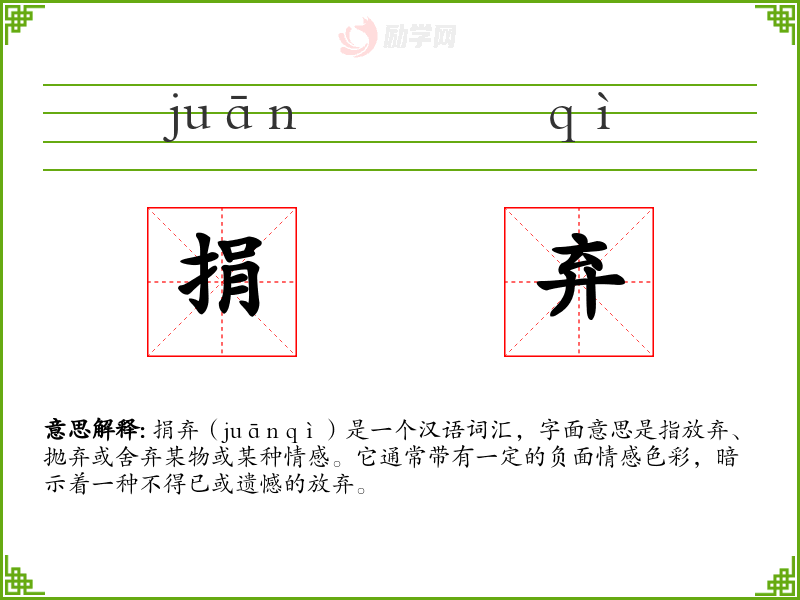 捐弃(juān qì)是一个汉语词汇,字面意思是指放弃、抛弃或舍弃某物或某种情感。它通常带有一定的负面情感色彩,暗示着一种不得已或遗憾的放弃。