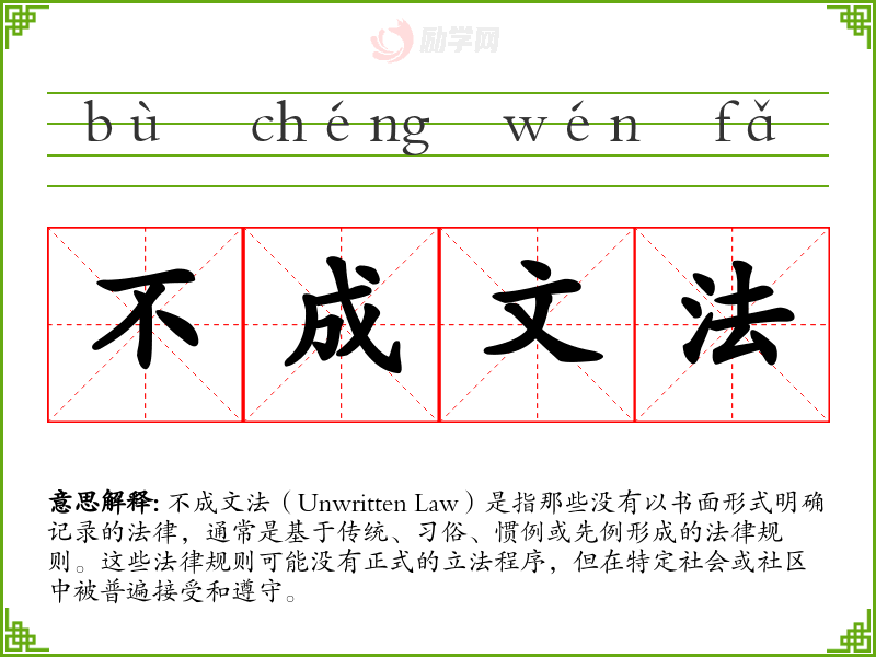 - 反义词:成文法(Written Law),指那些通过立法程序明确制定并记录在案的法律。
