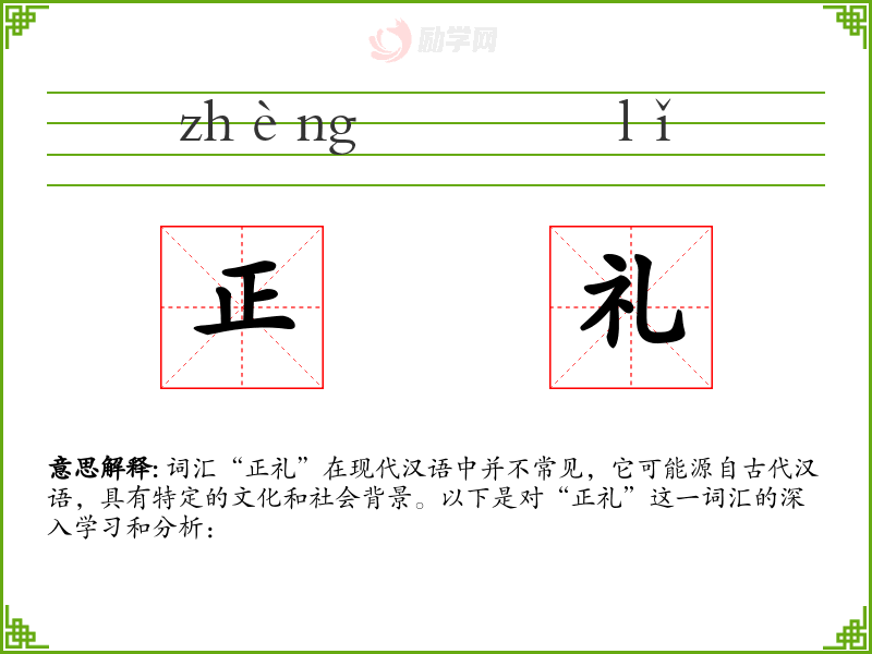 词汇“正礼”在现代汉语中并不常见,它可能源自古代汉语,具有特定的文化和社会背景。以下是对“正礼”这一词汇的深入学习和分析: