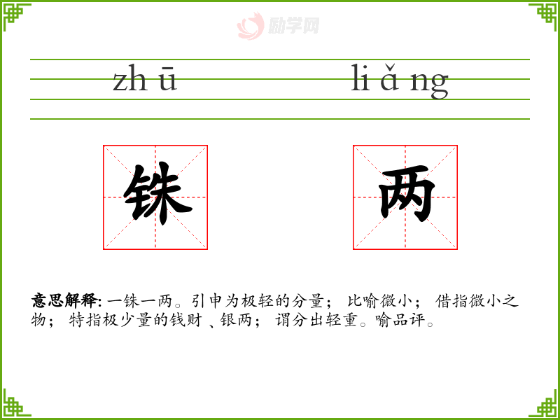 铢两的意思是:一铢一两。引申为极轻的分量; 比喻微小; 借指微小之物; 特指极少量的钱财﹑银两; 谓分出轻重。喻品评。