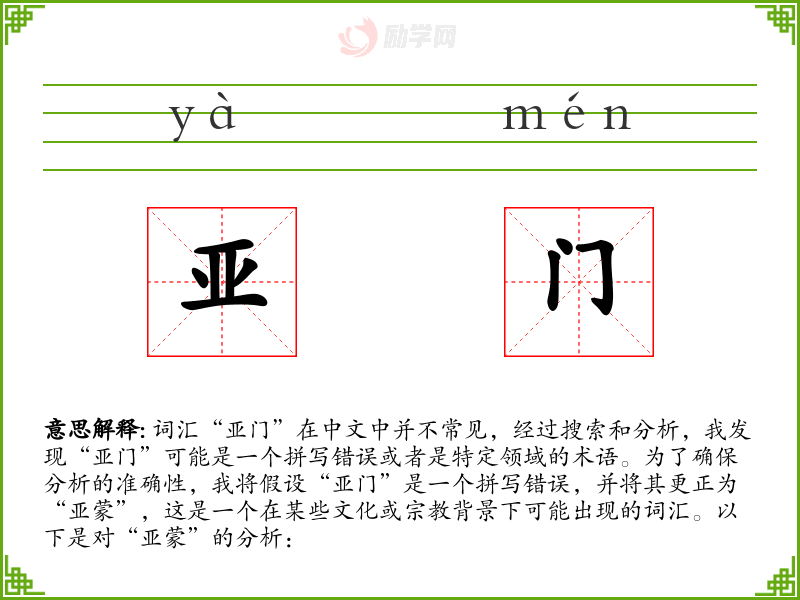 词汇“亚门”在中文中并不常见,经过搜索和分析,我发现“亚门”可能是一个拼写错误或者是特定领域的术语。为了确保分析的准确性,我将假设“亚门”是一个拼写错误,并将其更正为“亚蒙”,这是一个在某些文化或**背景下可能出现的词汇。以下是对“亚蒙”的分析: