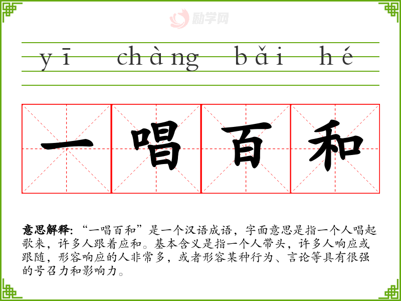 “一唱百和”是一个汉语成语,字面意思是指一个人唱起歌来,许多人跟着应和。基本含义是指一个人带头,许多人响应或跟随,形容响应的人非常多,或者形容某种行为、言论等具有很强的号召力和影响力。