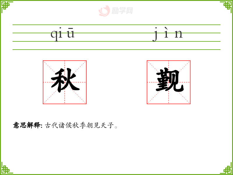 (形声。从见,堇(qín)声。本义:古代诸侯秋天朝见帝王)。