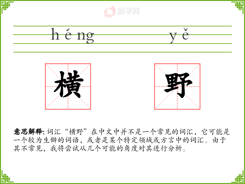 词汇“横野”在中文中并不是一个常见的词汇,它可能是一个较为生僻的词语,或者是某个特定领域或方言中的词汇。由于其不常见,我将尝试从几个可能的角度对其进行分析。